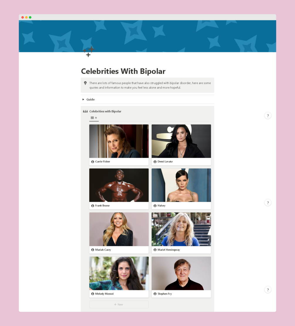 - Managing Symptoms - With sections for identifying your biggest risk and protective factors, a symptom tracker, mood tracker and a section for grounding exercises when you are getting too high or low.